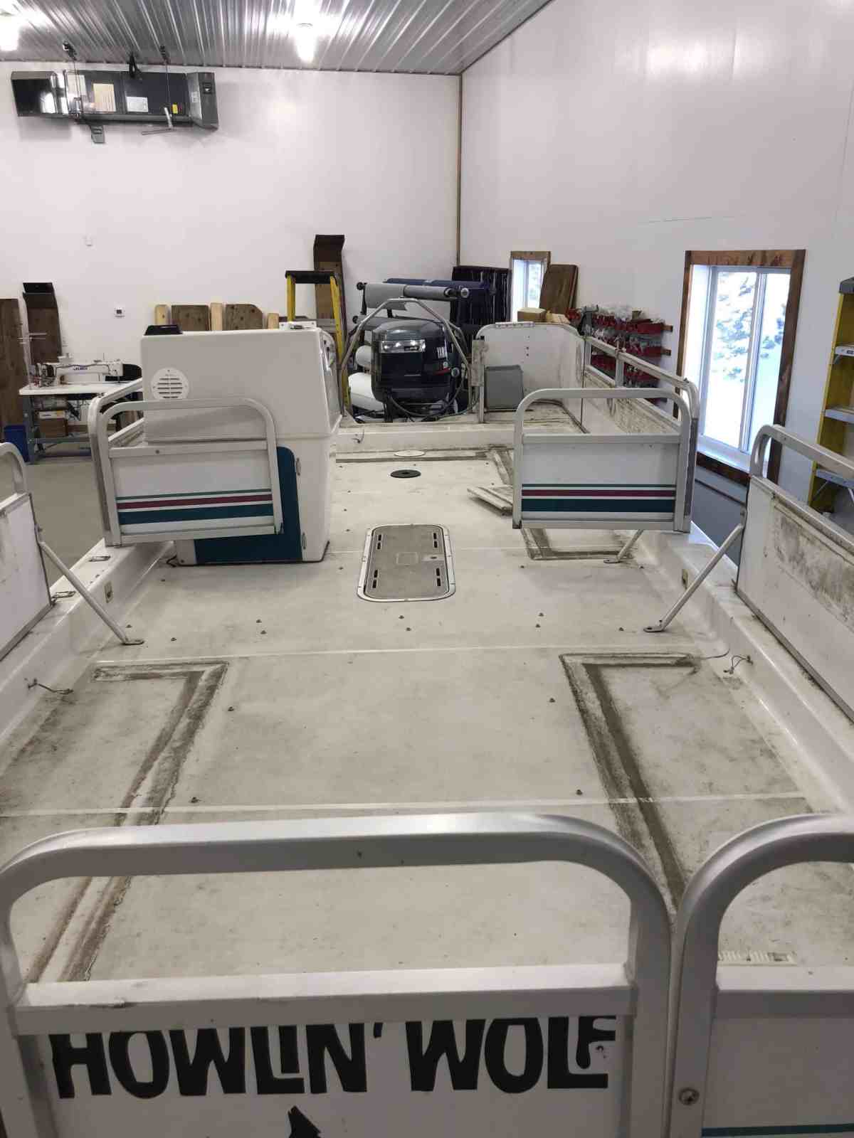 A frozen Howlin’ Wolf was delivered to Up North Canvas Company. The boat had more ice than expected. We need to have a little fiberglass work down to get the hull in better shape. They will also install a keel guard to protect the keel on the trailer, lift, and when beaching.